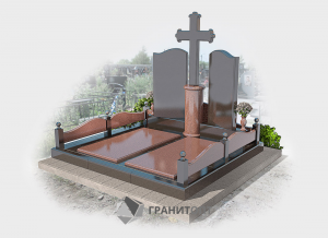 Гранитный крест с благоустройством могилы, традиционным сочетанием чёрного и коричневого цвета камней и лаконичным дизайном. Подойдет для двойного места захоронения.